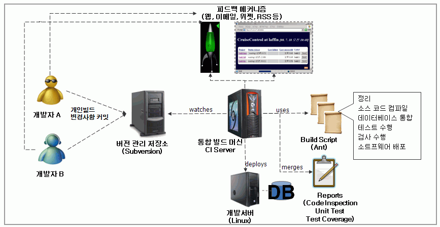 각 개발자들이 개인 빌드 과정을 거쳐 작성한 코드들을 통합하여 실행 가능한 산출물로 만들어 내는 일련의 과정을 통합 빌드라 하며 지속적이고 자동화된 통합을 위하여 CI를 사용하며 Continous