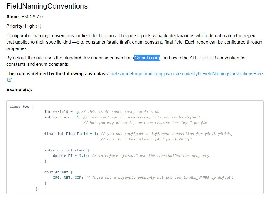 기본적으로이 규칙은 statndard java 명명 conveintion (camel case)을 사용하고 상수 및 열거 형 상수에 대해 ALL_UPPER 규칙을 사용합니다.