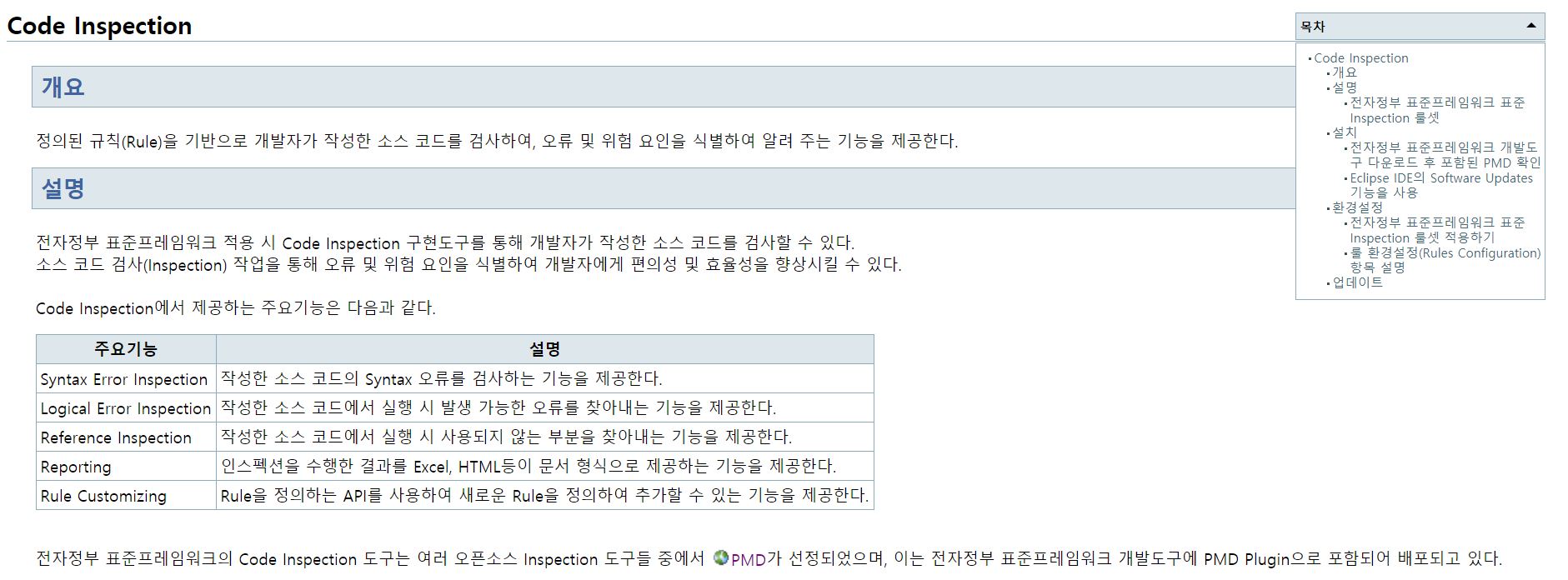 정의된 규칙(Rule)을 기반으로 개발자가 작성한 소스 코드를 검사하여, 오류 및 위험 요인을 식별하여 알려 주는 기능을 제공한다. 전자정부 표준프레임워크 적용 시 Code Inspection 구현도구를 통해
