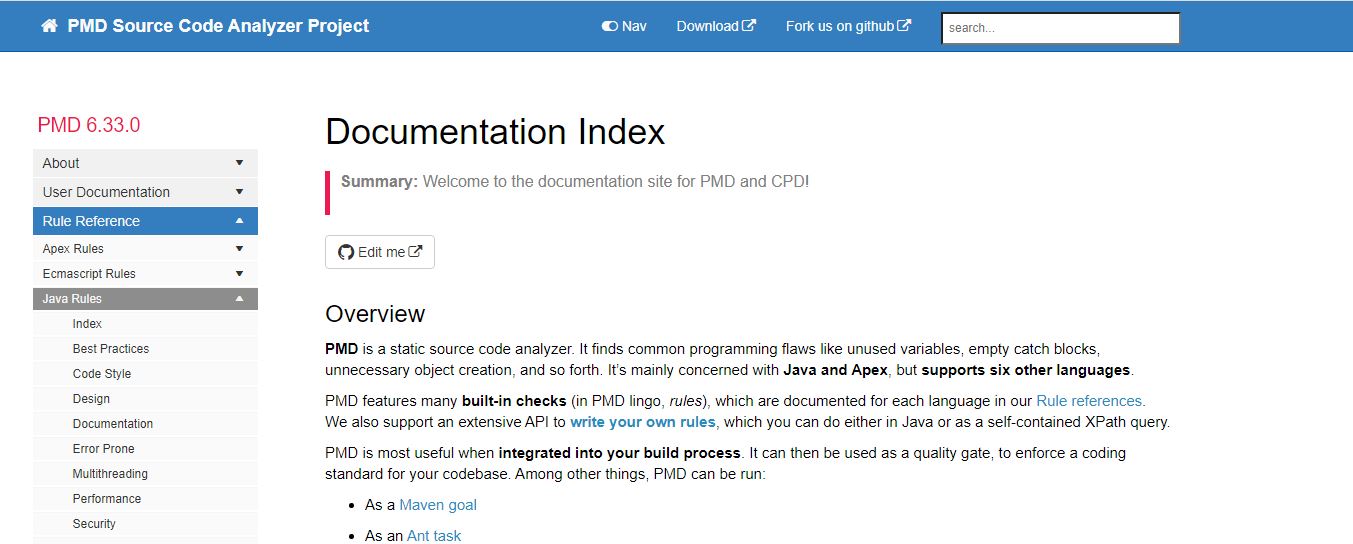 pmd 웹사이트로 들어가 Documentation Index를 확인합니다.