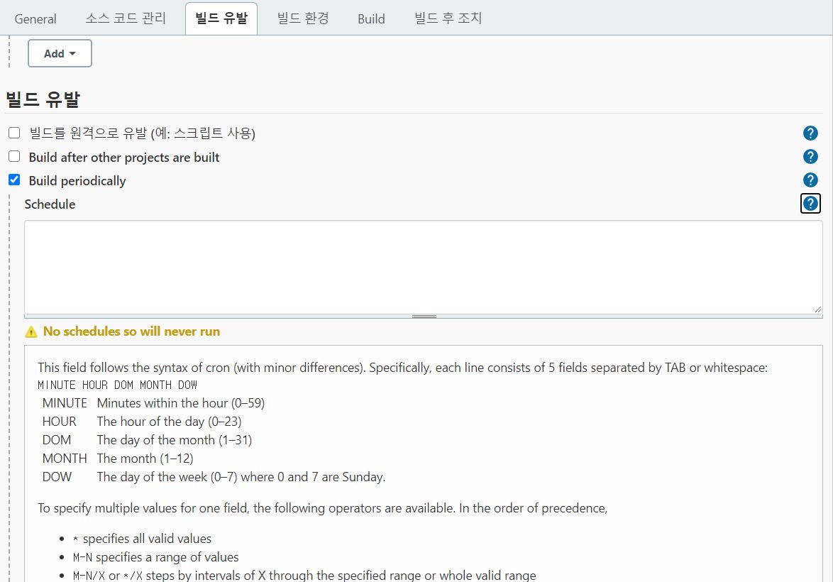 빌드유발로 들어가 Build periodically를 체크 해줍니다.