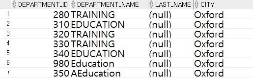 [Oracle] PL/SQL SELECT d.department_id, d.department_name, e.last_name, l.city FROM departments d left join employees e on d.manager_id = e.employee_id left join locations l on d.location_id = l.location_id; 실행결과 IT/Oracle 2021.04.23